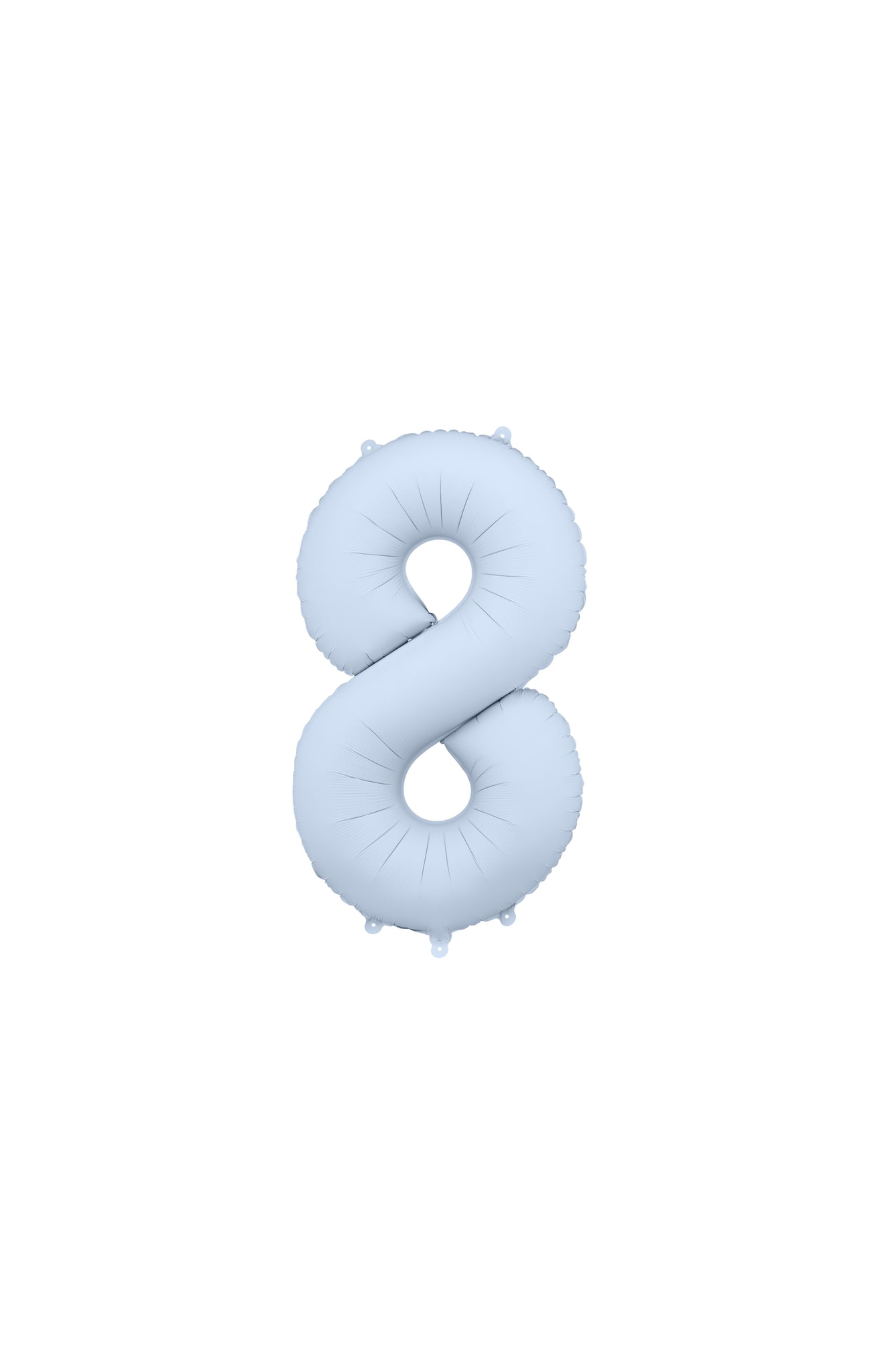 Matēts folija balons ar ciparu 8 gaiši zilā krāsā. Izmērs pirms piepūšanas – aptuveni 100 cm (39"), izmērs pēc piepūšanas – aptuveni 86 cm (34"). Var piepūst gan ar gaisu, gan ar hēliju. Komplektā iekļauts salmiņš. Balons ir pašnoslēdzošs. Tam ir āķīši ērtai piestiprināšanai pie dekorācijām.