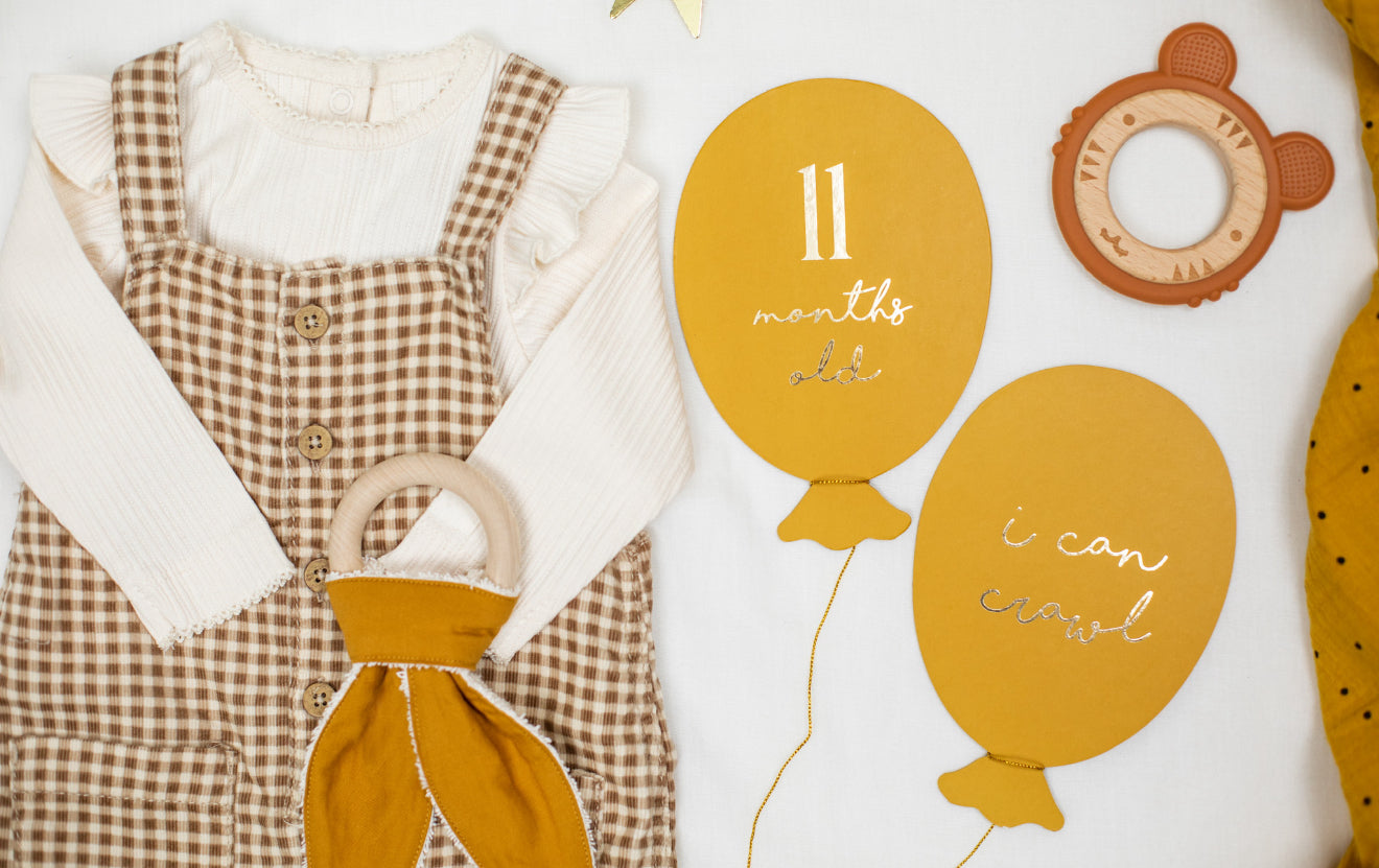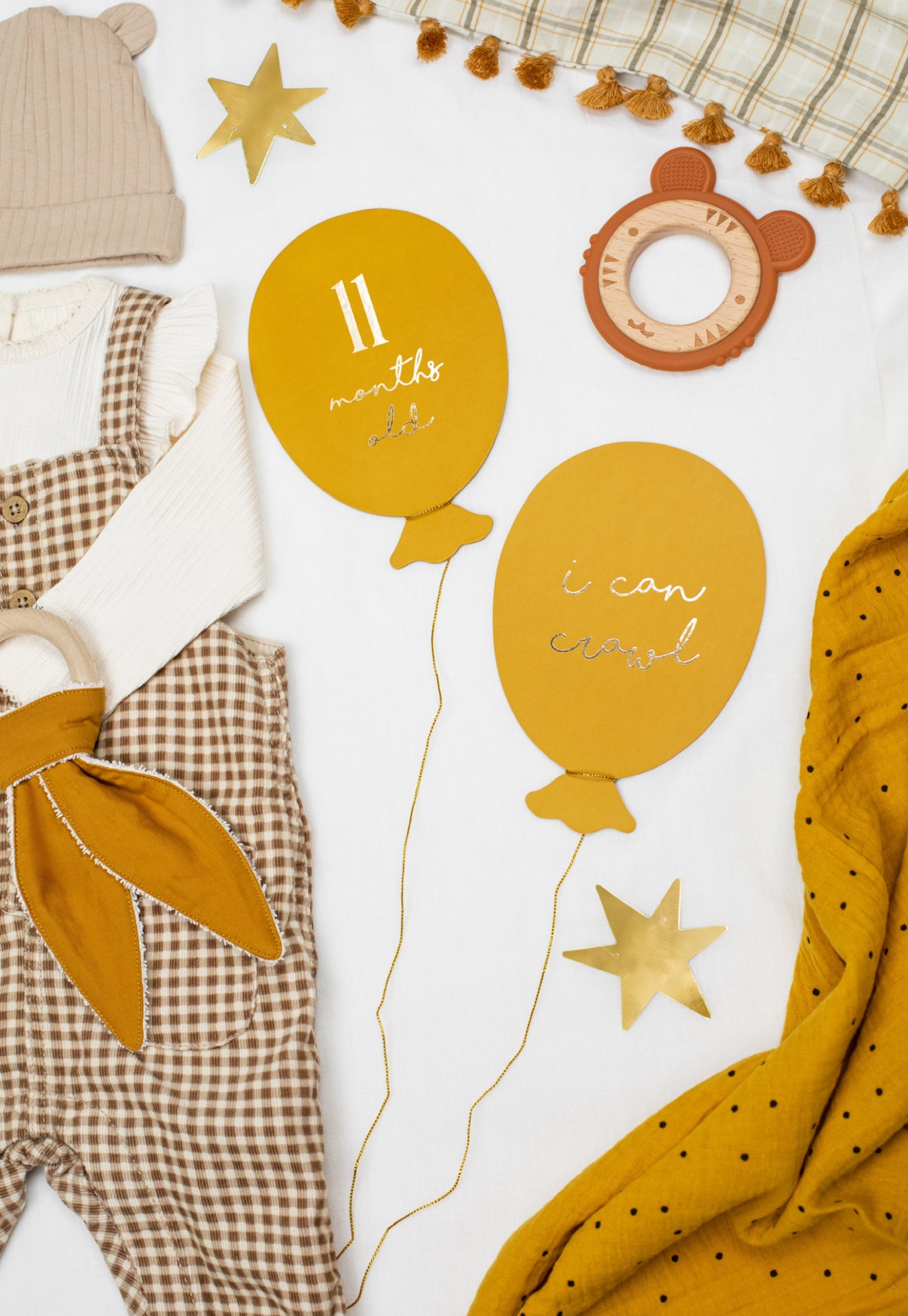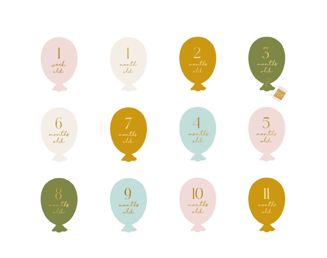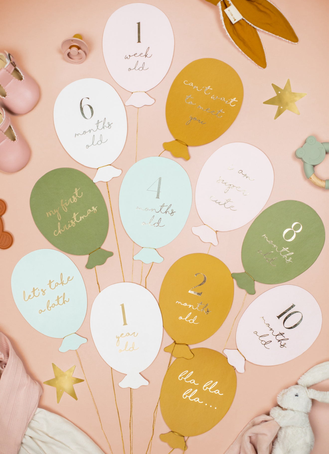 Foto atskaites (milestone) kartītes, krāsu mikss. Komplektā ietilpst 12 balona formas kartītes ar metāliskām uzdrukām un 300 cm gara zelta aukliņa. Vienas kartītes izmērs apmēram 11,5 × 7 cm.