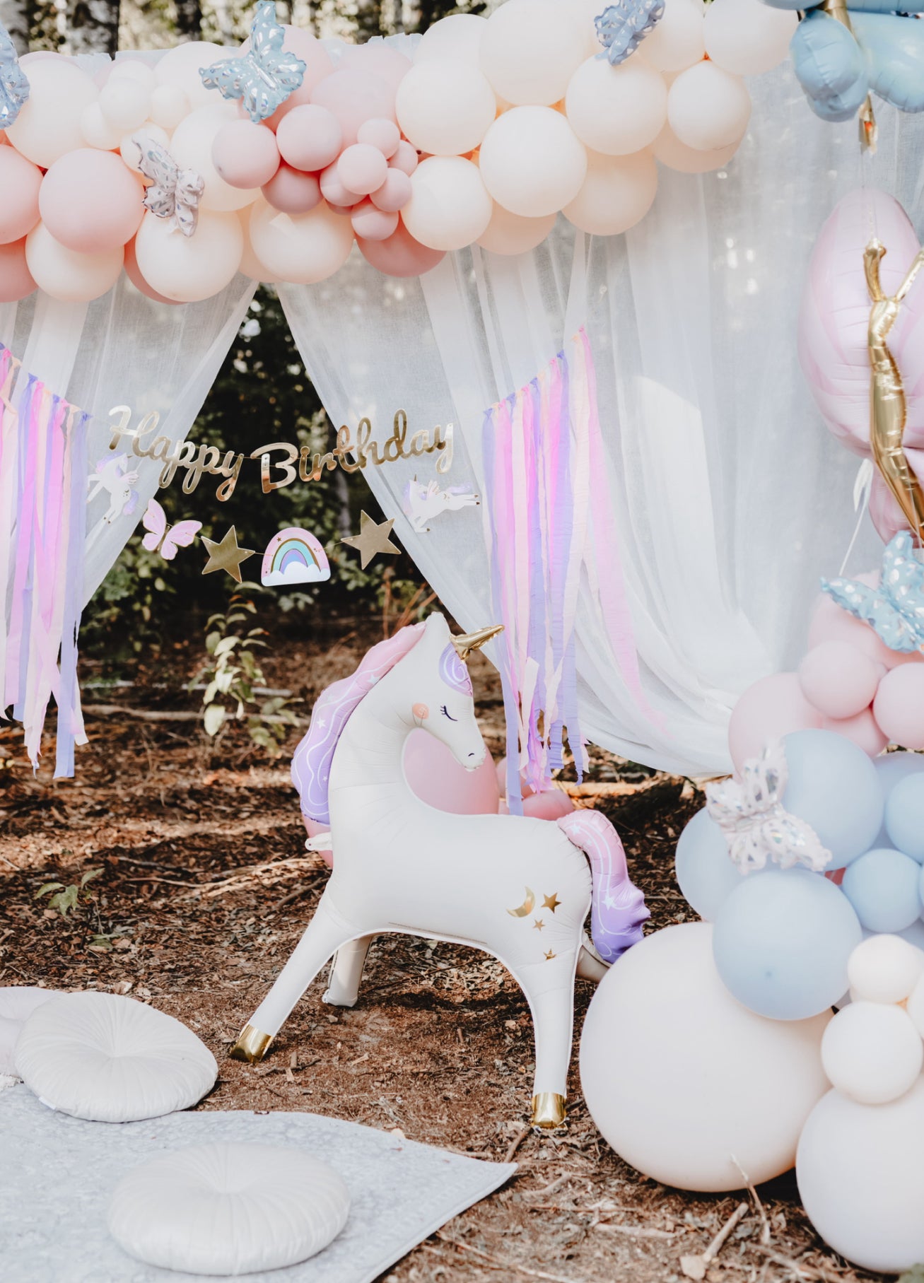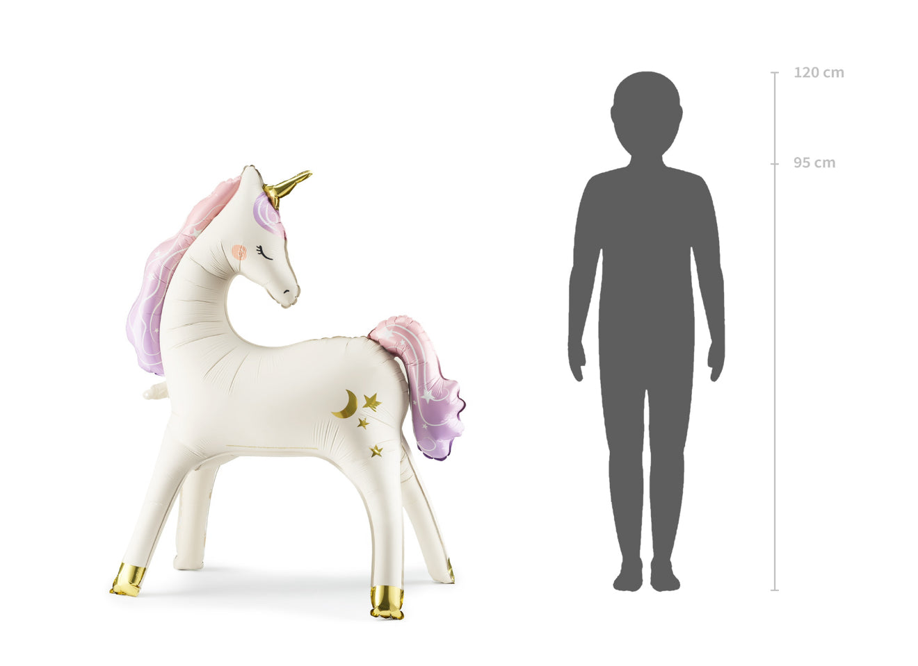 Stāvošs folijas balons “Vienradzis”, bēšā krāsā ar zelta un varavīksnes elementiem, matēta apdare. Izmēri pirms piepūšanas: 104 × 117 cm (41 × 46''), izmēri pēc piepūšanas: 95 × 86 cm (37,5 × 34''). Paredzēts piepūšanai ar gaisu. Pašnoslēdzošs balons. Komplektā ir salmiņš.