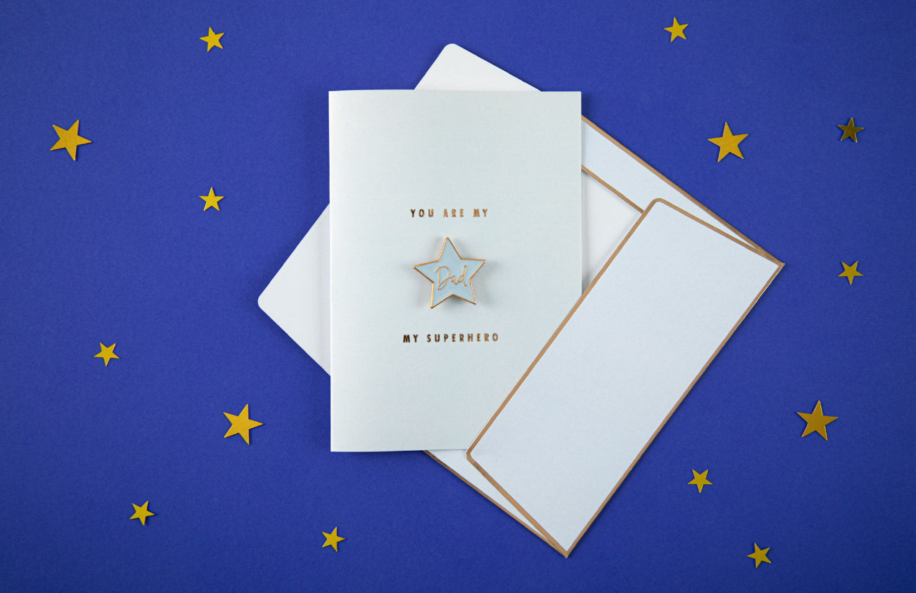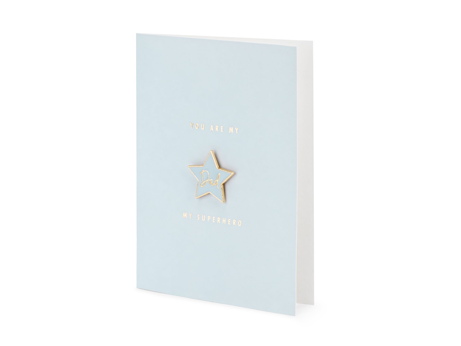 Zilā krāsā kartīte ar zelta metālisku apdruku, emaljas piespraude zvaigznes formā ar uzrakstu “Dad” un zila aploksne ar zelta metālisku apdruku. Kartītes izmērs apmēram 10,5 × 14,8 cm, emaljas piespraudes izmērs apmēram 3 × 3 cm.