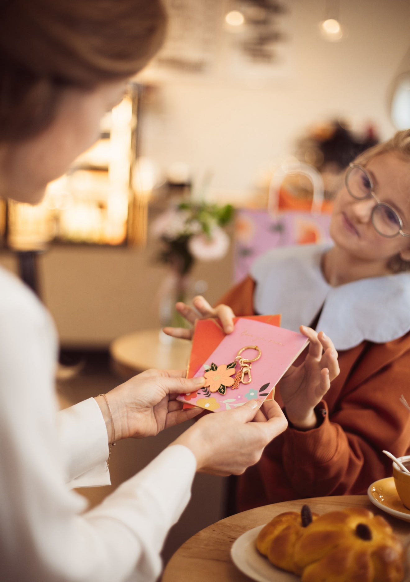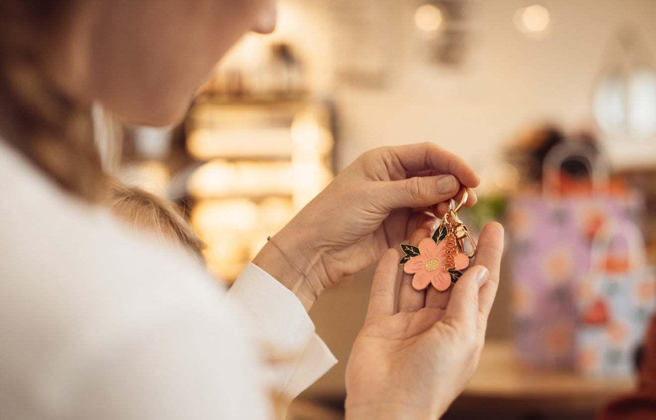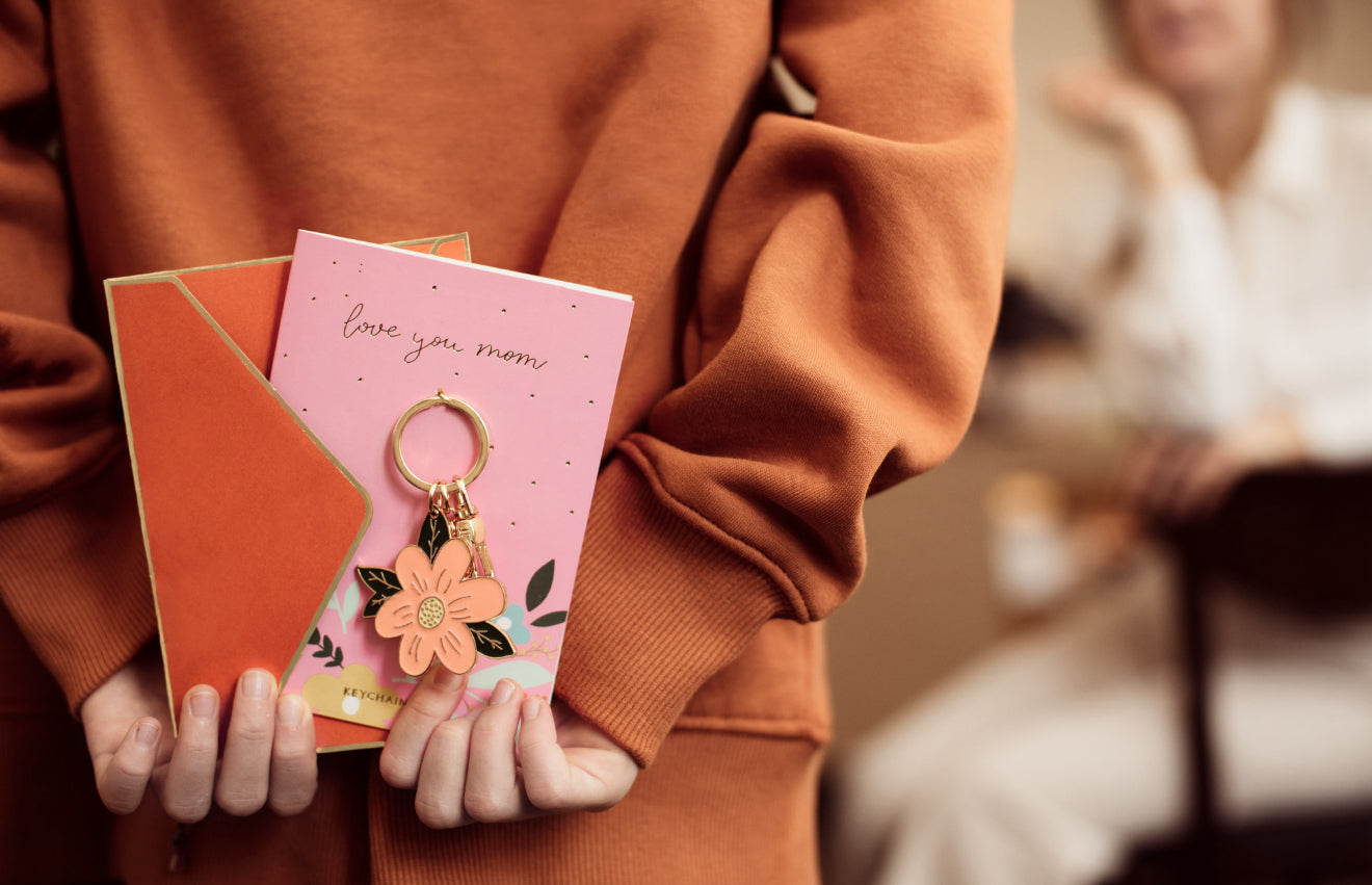 Rozā krāsas kartīte ar uzrakstu “Love you mom”, atslēgu piekariņš zieda formā un sarkana aploksne. Aploksnes izmērs apmēram 12 × 16 cm, atslēgu piekariņa augstums apmēram 8,5 cm.