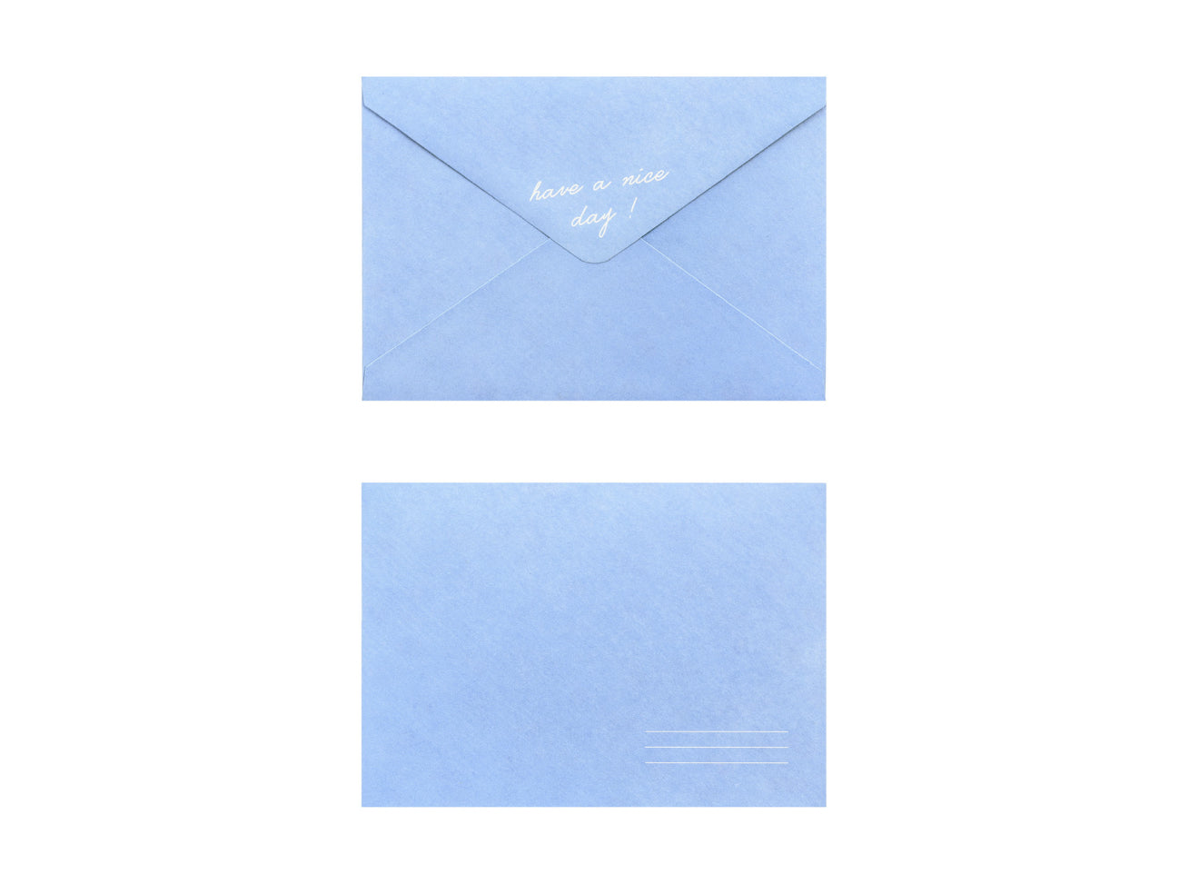 Zilā krāsas kartīte ar uzrakstu “Have a nice day!”, divas rokassprādzes un zila aploksne ar krāsainu apdruku. Kartītes izmērs apmēram 10,5 × 14,8 cm.