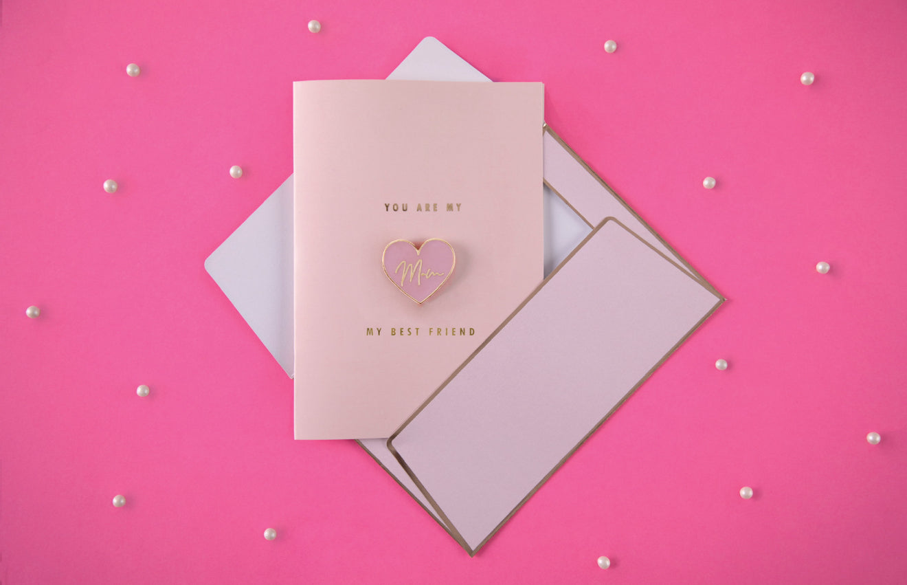 Rozā krāsas kartīte ar zelta metālisku apdruku, emaljas piespraude sirds formā ar uzrakstu “Mom” un rozā aploksne ar zelta metālisku apdruku. Kartītes izmērs apmēram 10,5 × 14,8 cm, emaljas piespraudes izmērs apmēram 3 × 2,7 cm.