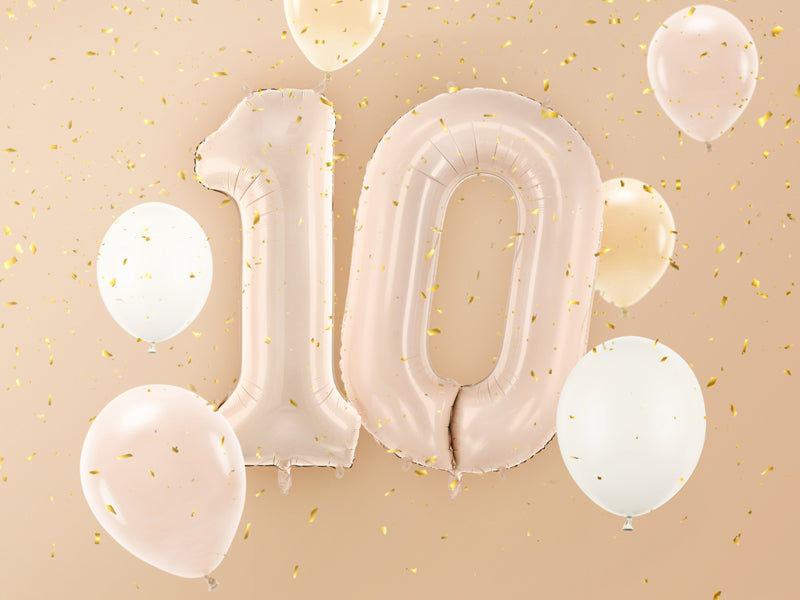 Matēts folija balons ar ciparu 0 tumši bēšā krāsā. Izmērs pirms piepūšanas – aptuveni 86 cm (34"), izmērs pēc piepūšanas – aptuveni 72 cm (28"). Var piepūst gan ar gaisu, gan ar hēliju. Komplektā iekļauts salmiņš. Balons ir pašnoslēdzošs. Aprīkots ar āķīšiem ērtai dekorāciju stiprināšanai.