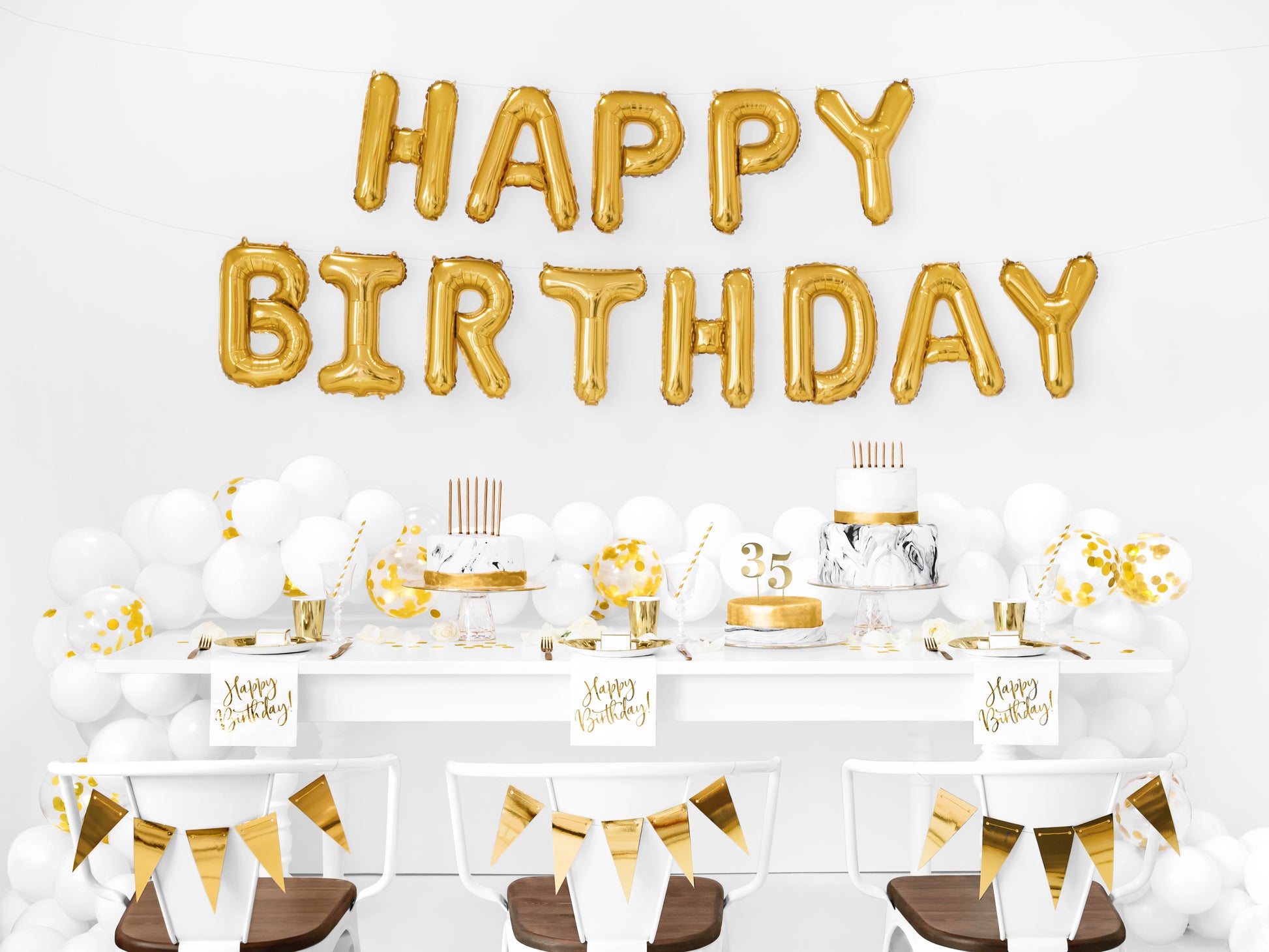 Matēts folijas balons “Happy Birthday”, zelta krāsā, izmērs apm. 340 × 35 cm (134 × 14''). Piemērots piepūšanai ar gaisu. Pašnoslēdzošs balons ar 4 āķiem ērtai stiprināšanai pie lentes.