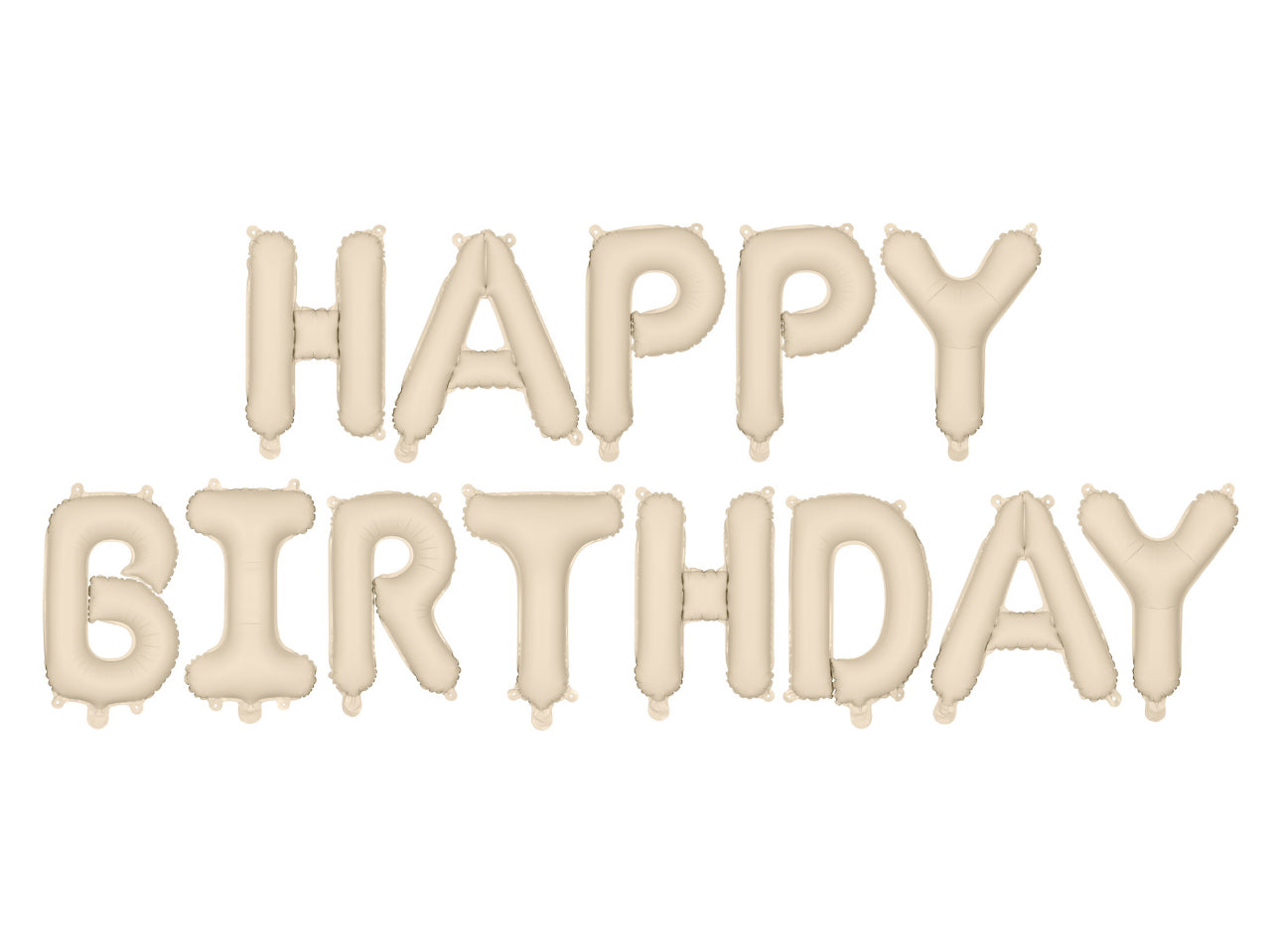 Matēts folijas balons “Happy Birthday”, bēšs, izmērs apm. 340 × 35 cm (134 × 14''). Piemērots piepūšanai ar gaisu. Pašnoslēdzošs balons ar 4 āķiem ērtai stiprināšanai pie lentes.