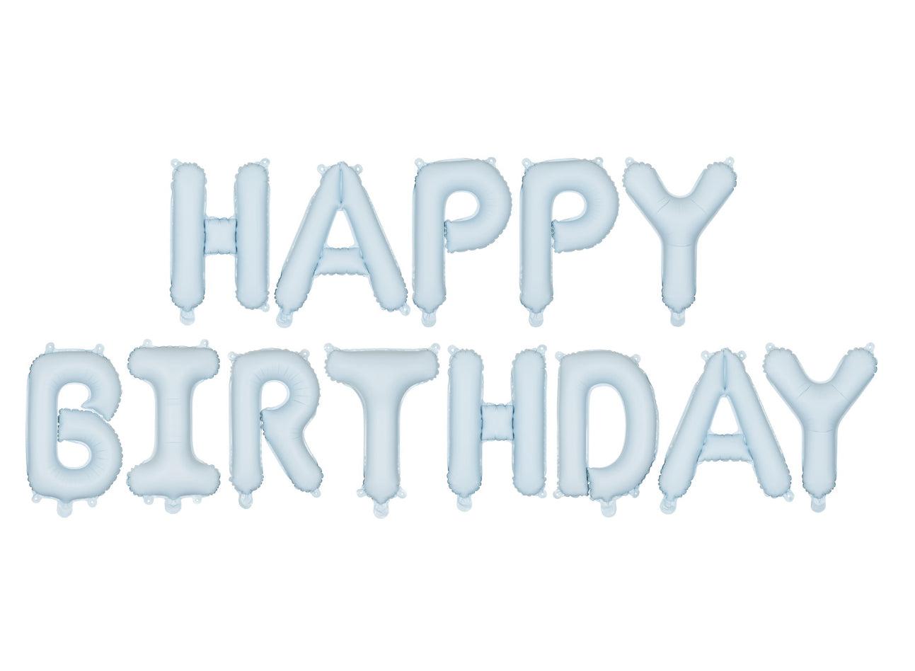 Matēts folijas balons “Happy Birthday”, gaiši zilā krāsā, izmērs apm. 340 × 35 cm (134 × 14''). Piemērots piepūšanai ar gaisu. Pašnoslēdzošs balons ar 4 āķiem ērtai stiprināšanai pie lentes.