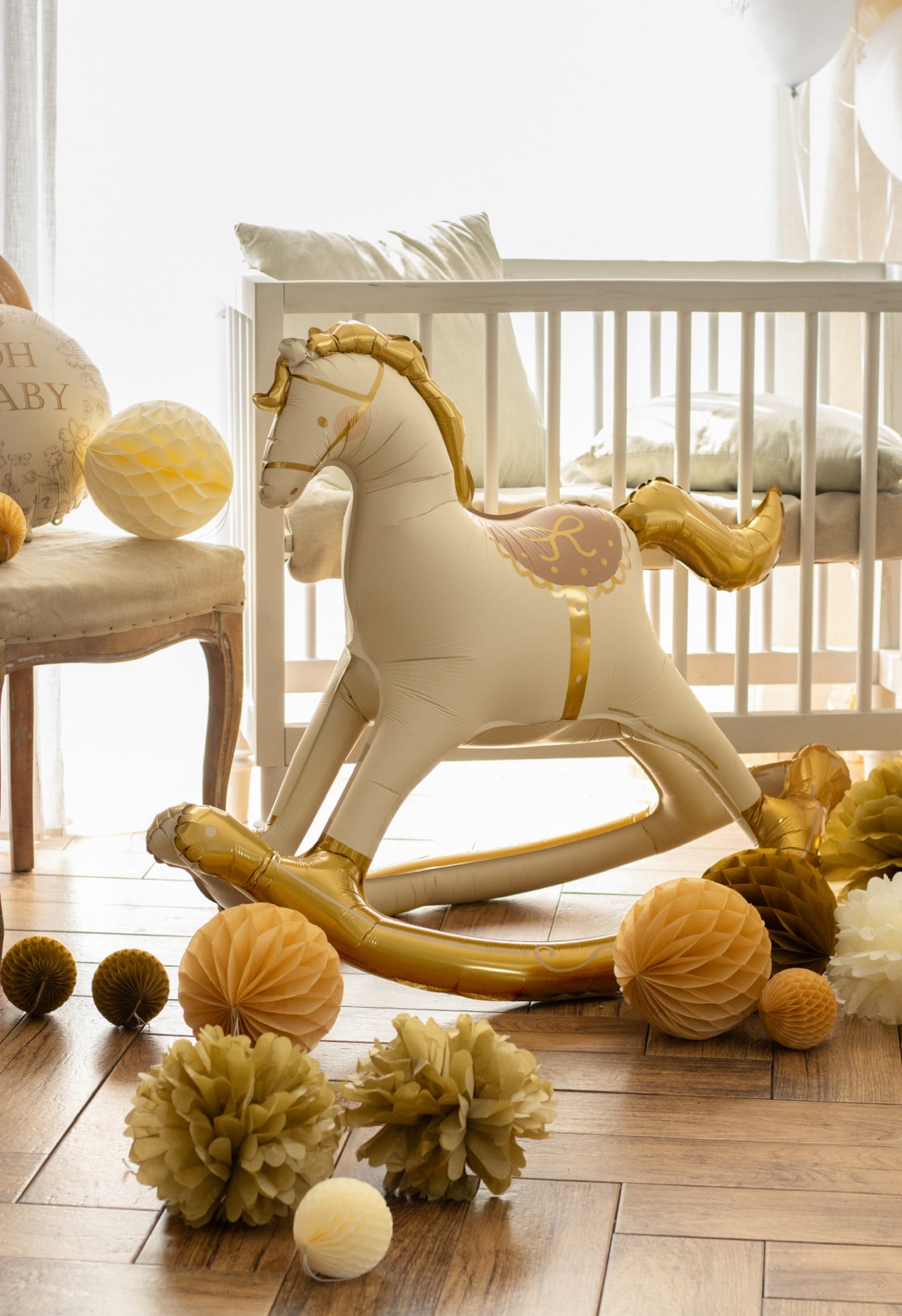 Stāvošs folijas balons “Šūpuļzirgs”, krāsu miks. Izmēri pirms piepūšanas apm. 118 × 104 cm (46,5 × 41''), izmēri pēc piepūšanas apm. 106 × 86 cm (41,5 × 34''). Paredzēts piepūšanai ar gaisu. Komplektā ir salmiņš.