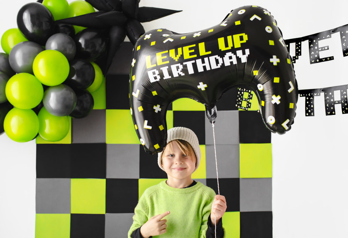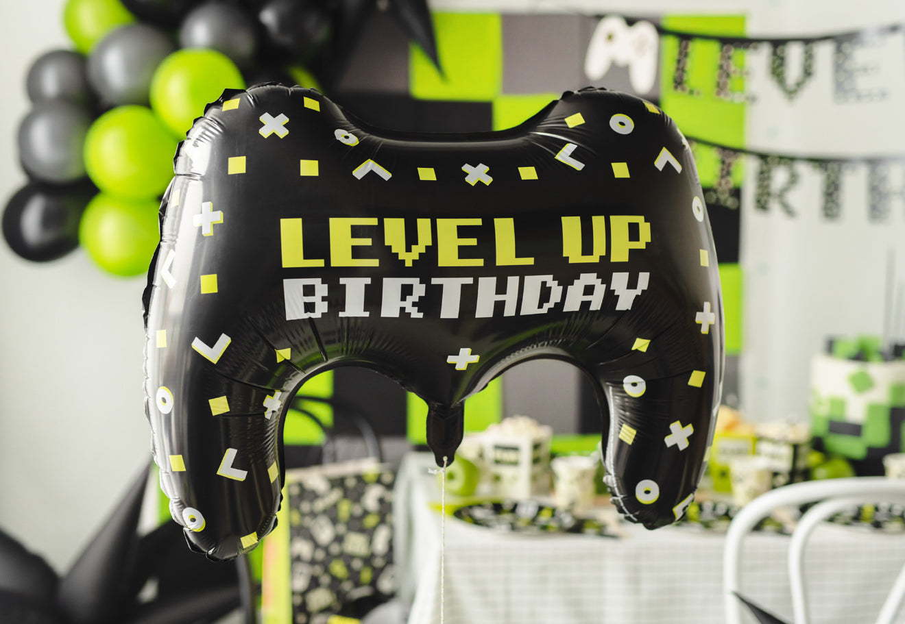 Folijas balons “Spēļu pults”, krāsu miks. Melns balons ar krāsainu apdruku un uzrakstu “Level Up Birthday”, izmērs pirms piepūšanas apm. 72 × 52 cm (28 × 20,5''), izmērs pēc piepūšanas apm. 60 × 45 cm (25,5 × 18''). Piemērots piepūšanai ar gaisu un hēliju. Komplektā ir salmiņš.