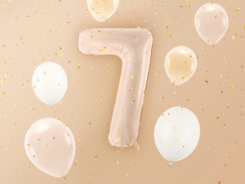Matēts folija balons ar ciparu 7 tumši bēšā krāsā. Izmērs pirms piepūšanas – aptuveni 86 cm (34"), izmērs pēc piepūšanas – aptuveni 72 cm (28"). Var piepūst gan ar gaisu, gan ar hēliju. Komplektā iekļauts salmiņš. Balons ir pašnoslēdzošs. Aprīkots ar āķīšiem ērtai dekorāciju stiprināšanai.